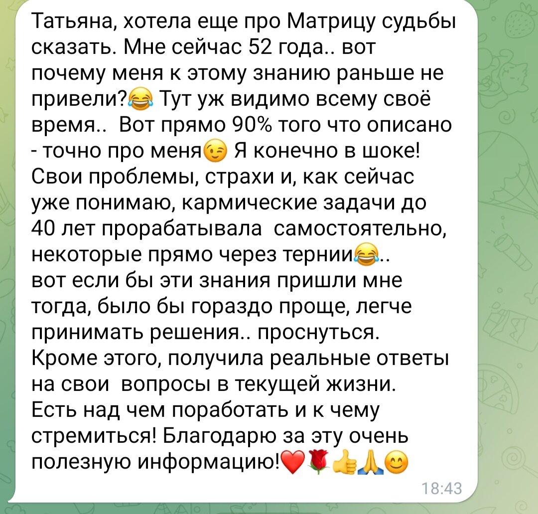 Подробно о методе в подборке "Нумерология" Или ниже по ссылкам: Чтобы заказать расклад по методу Матрица судьбы напишите мне в телеграм: Расклад делается по вашей дате рождения. Время рождения в данном методе не понадобится. Ценность 5000 руб 4000 руб (апрель-май действует скидка) Расклад делаю по совершению оплаты и высылаю вам в течении нескольких дней в файлах. Вы самостоятельно изучаете информацию и если возникают вопросы можете написать мне и я отвечу. Информация изложена в максимально доходчивой форме, при прочтении очень много озарений и осознаний. Вы словно собираете себя воедино, понимая все свои грани. 💎 Осознавая задачи с которыми пришли в эту жизнь и получаете ключики к гармонизации сфер жизни 🗝 Заказать расклад здесь:
