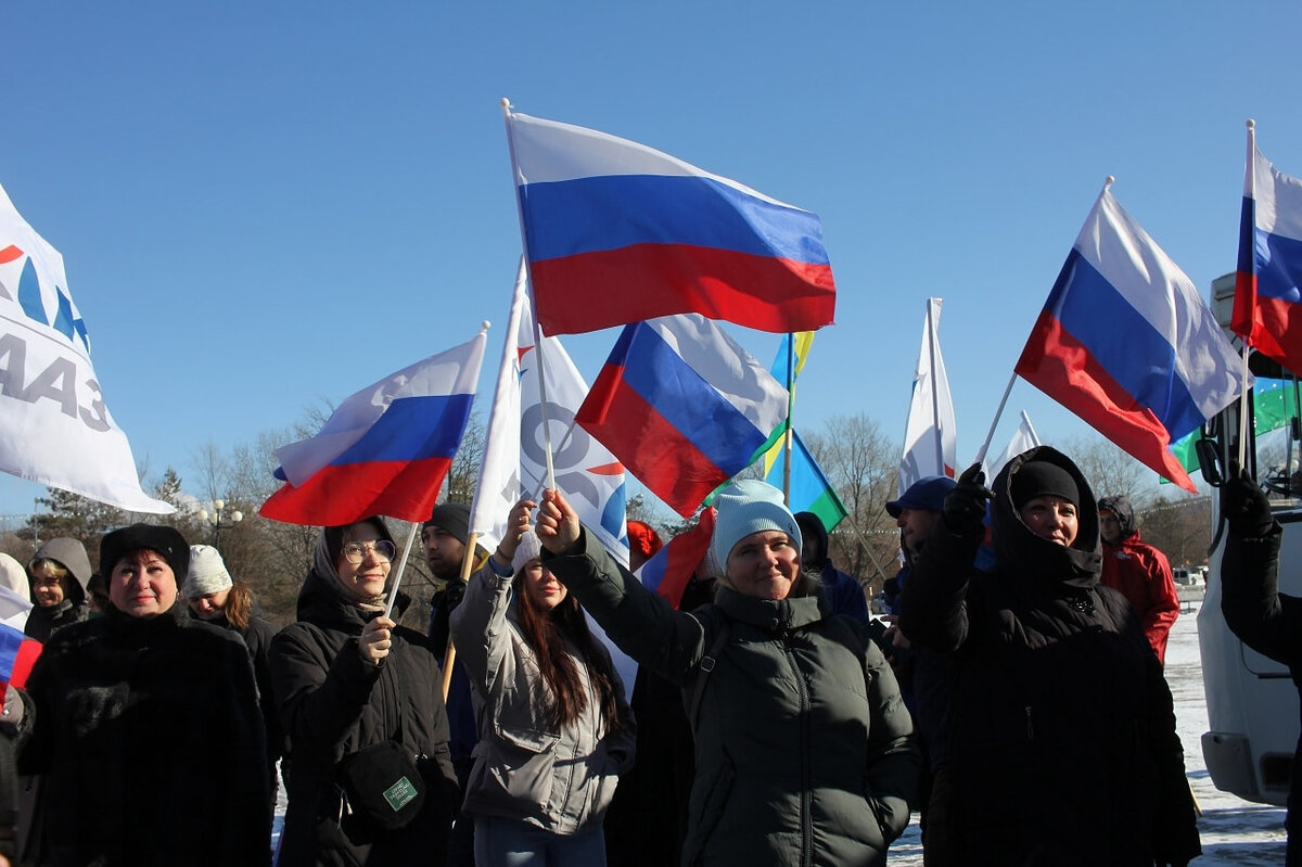 Собравшихся поздравляли глава города, председатель думы и представитель Амурской епархии. Все их речи сводились к одному – надо объединяться против «посягающего на наши ценности запада» и «для победы нашего оружия», как выразился служитель церкви. Замерзшая на неласковом ноябрьском ветру публика хлопала, заодно согреваясь, и изредка кричала «Ура!».
