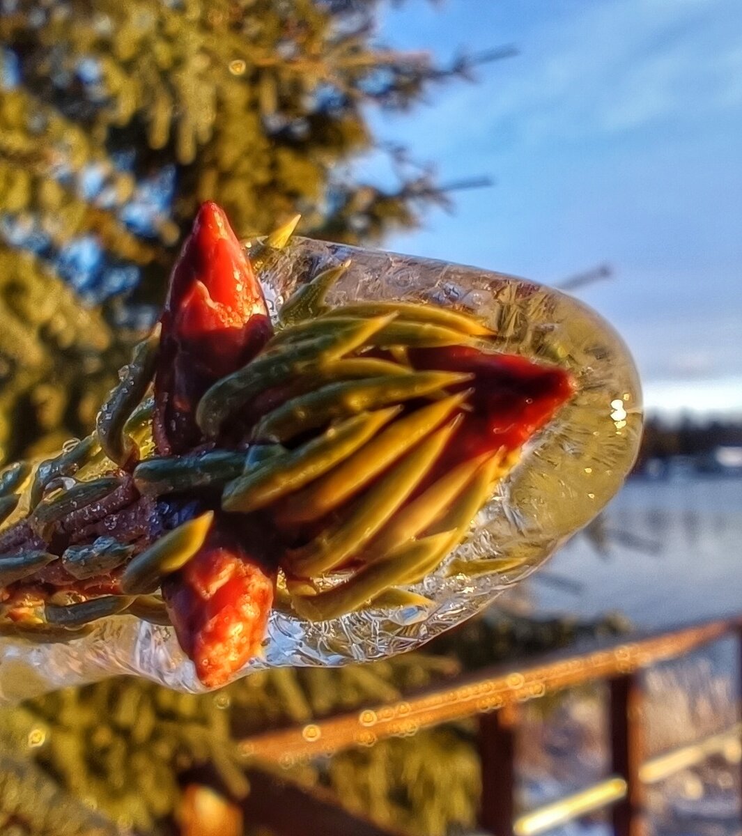 Пятница, предпраздничный день, у нас сокращён рабочий день на час. А в пятницу женщины работают до 12 дня, поэтому в 11 я уже освободилась от работы, и в начале двенадцатого уже была дома. Погодка прекрасная. Солнышко, небольшой морозец около -2 Накануне был дождь, и он застеклил и разукрасил хвою на елях, и всевозможные кустики окутал в хрустальный наряд К обеду "хрусталь" разбился, облака спрятали солнце, и опять всё стало хмуро Волны сгоняют шугу, к берегу. Ноябрьские качели, от -5, до +1. Муж уехал к маме, догуливать оставшийся отпуск, а я с котом и собакой дома, на хозяйстве. Мой отпуск ещё впереди, специально взяла его на перволедие, надеюсь что к началу декабря озеро встанет. Всю неделю проболела, кашель, насморк одолел. Больничный брать не стала, обычная простуда в лёгкой форме. Пройдёт! Возвращаюсь к вчерашнему дню. В 12 дня собрала нехитрые снасти. Зимняя удочка с прошлого года, и подвязаная маленькая блесна, очень похожи на маролистик, но чуточку широкая, с та