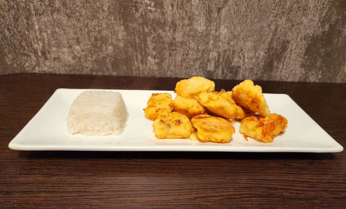 Это блюдо с радостью едят даже дети, которые говорят, что не терпеть не могут рыбу :) Состав: 300 г. замороженного рыбного филе 2 яйца 3-4 ложки муки 200 г. риса (для гарнира) соль Готовим кляр для рыбы: слегка взбиваем в миске 2 яйца, добавляем соль и муку. Размешиваем густое тесто, пока в нем не останется комочков. Рыбу размораживаем не до конца (так, чтобы она не потеряла форму, но уже могла резаться). Режем ее на кубики, солим и обваливаем в муке. Аккуратно смешиваем рыбу с кляром так, чтобы кусочки рыбы остались целыми и не потеряли форму. Выкладываем рыбные кусочки на разогретую сковороду с маслом. Жарим на среднем огне около 7-8 минут. Затем аккуратно переворачиваем каждый кусочек и жарим еще около 7-8 минут. Рис варим в подсоленной воде 20-30 минут. Я подаю это блюдо с соусом тартар или с салатом из сырой моркови, майонеза и чеснока. Приятного аппетита!