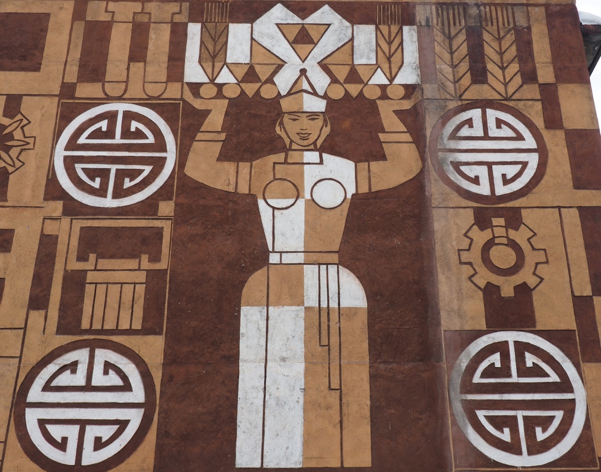 Моей последней точкой в Туране стал дом культуры им. Марка Оюна, что в трёх кварталах северо-западнее городской площади. Построенное в 1980 году как ДК "Колос". Г-образное здание, конечно, в первую очередь запоминается соцреалистическими панно, не уступающими кызыльским и абаканским.