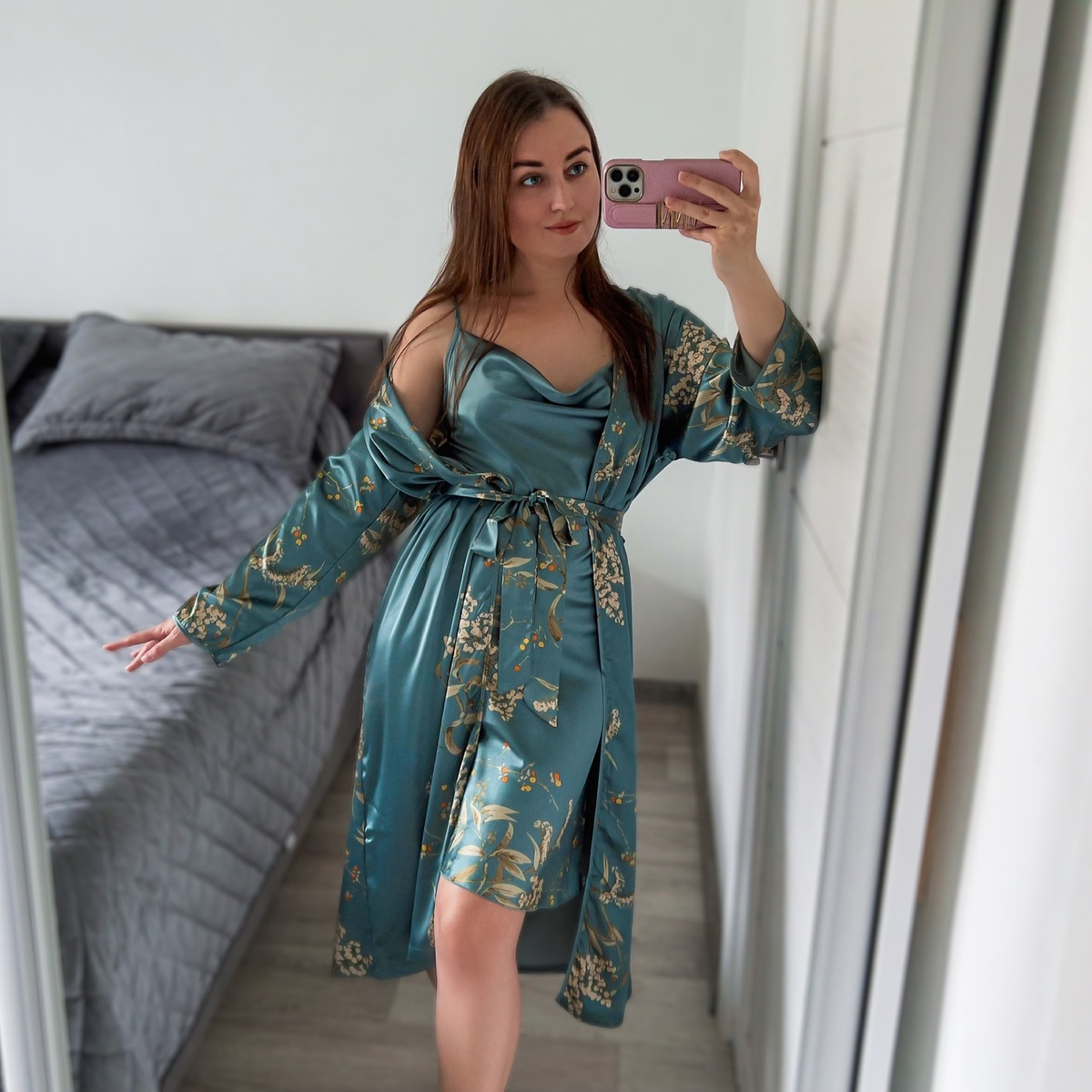 Ну очень красивый домашний комплект из ночной сорочки и халата. В нём прекрасно всё: и цвет, и принт, и фасон. Заказывала на AliExpress в магазине MeiKeDaiNicey Store. По ссылке в наличии 3 расцветки. На параметры 86/66/94, рост 165 см отлично подошел размер S. Внимание: этот пост содержит рекламные ссылки (если их можно таковыми назвать). Вещь куплена мной на AliExpress, все фото мои, мнение о товаре тоже моё. Прямая ссылка на товар на AliExpress: https://aliclick.shop/r/c/1s3eqqgufto4o0xc?erid=Kra23ss1d Материал: полиэстер. Плотный, приятный, нежный, как шёлк. Не тянется. Сорочка с регулируемыми бретелями. В груди ткань в 2 слоя, вкладышей нет и кармашки под них не предусмотрены. Халат с длинными рукавами. В комплекте идет пояс, который заправляется в шлёвки на халате. Качество комплекта отличное, пошив аккуратный. К покупке рекомендую!)) Если вам интересны обзоры товаров с AliExpress, если вы хотите стильно одеваться и при этом тратить минимум средств,