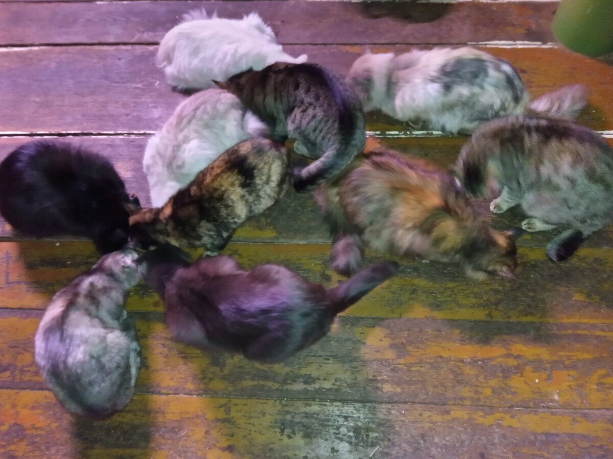 Пока кошки хрустели сухим кормом (на фото 10 из тринадцати, котенок ел мягкий корм, двое измеряли температуру на улице, теплеет) я замесила "ленивые голубцы с картошкой." Капуста савойская (можно любую), две сырых картофелины, пригоршня сухого риса, мелконарезанное мясо курицы. Все измельчается и перемешивается. Можно добавлять яйцо, морковку и лук. Не солю! Насыпала немного пажитника. В сковороде разогреть немного растительного масла, выложить смесь, хорошо ее утрамбовать, залить водой так, чтобы смесь была закрыта- этой жидкости вполне хватит для разваривания риса. Сначала довести до кипения, потом тушить под крышкой до размягчения риса. Крышку открыть, подсушить. Без яиц будет рассыпчато. И только потом два варианта на выбор: или залить соусом (томатная паста, сметана и пр. на ваш вкус) всю смесь, или каждую порцию сдабривать по отдельности уже в своей тарелке. Ну, для разнообразия вкусовых впечатлений! На фото в тарелке томатная паста и соевый соус. Следующую порцию (а их остало