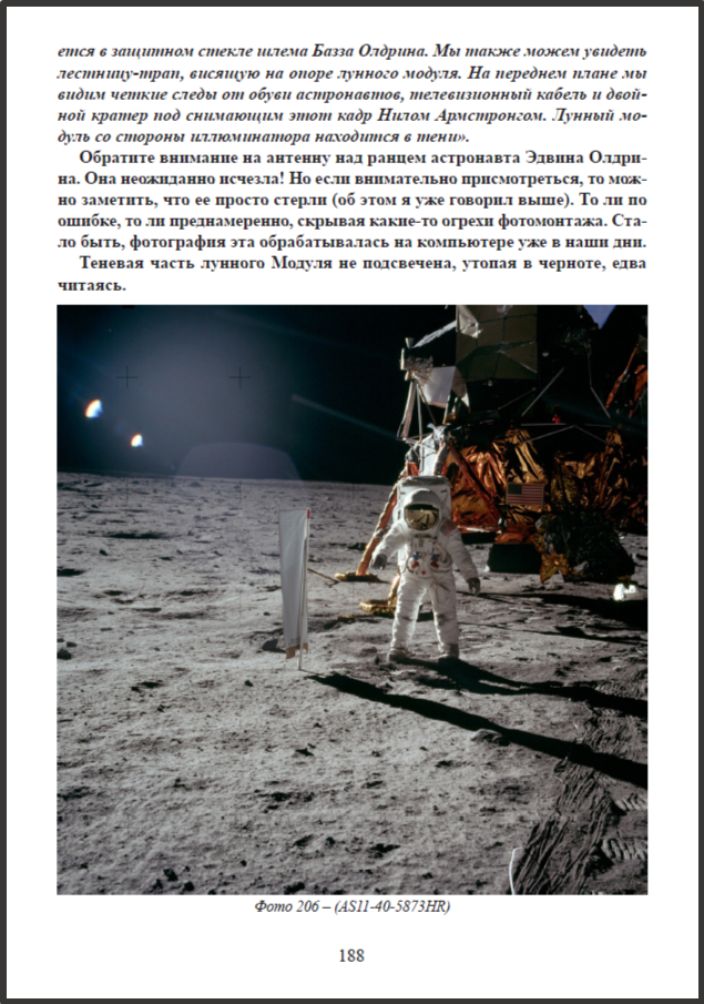 - "Обратите внимание на антенну над ранцем астронавта Эдвина Олдрина. Она неожиданно исчезла! Но если внимательно присмотреться, то можно заметить, что ее просто стерли (об этом я уже говорил выше). То ли по ошибке, то ли преднамеренно, скрывая какие-то огрехи фотомонтажа."