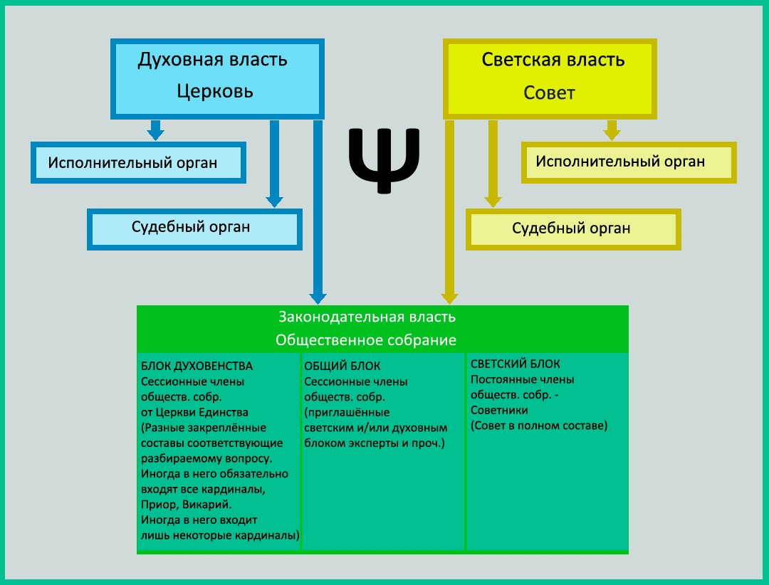 Приветствуем Вас, наши дорогие Читатели! Пару месяцев назад у Александра, более известного как Шут, спросили - как устроена система управления во вселенной одной из его историй - "Пси". Фото ответа мы приложим ниже. Но если вдруг вы (как и мы порой) путаетесь, кто есть кто и кто за кем идет, мы подготовили для вас небольшой разбор, собственно, кто есть кто и кто за кем идет :) ! Сразу оговоримся: так мы поняли эту систему. Возможно, где-то есть погрешности. Если вы что-то заметили, пишите нам, поправим. Итак, как мы знаем в "Пси" есть два основных органа власти: Церковь (духовная власть) и Совет (светская власть). Больше всего власти сосредоточено в руках Церкви, для начала рассмотрим эту ветвь. Во главе Церкви Единства стоит Викарий. Условно, он самый главный. Несмотря на то, что он представитель именно духовной власти, даже самые высокопоставленные члены Совета конкурировать с ним не могут. На данный момент, Викарием является Жан-Франсуа, который предварительно является и нашим ан