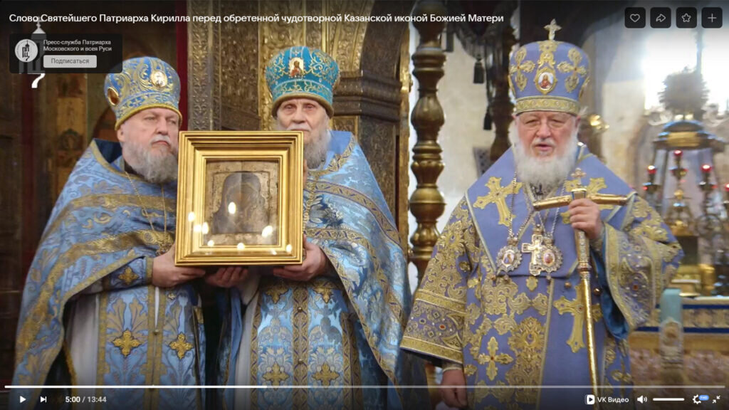 Патриарх Московский и всея Руси Кирилл представил в Успенском соборе Московского Кремля оригинальную Казанскую икону Божией Матери, считавшуюся утерянной более века назад. Он отметил, что именно перед этой иконой молился князь Пожарский в самый опасный период русской истории. Икона датируется 1580 годом. Предстоятель РПЦ сообщил, что икона ранее не показывалась народу и находилась в келье Патриарха, так как ему нужно было многое выяснить, прежде чем объявить об этом открытии. «Это событие можно отнести к историческим событиям… Вы видите перед собой подлинник чудотворного образа Казанской Божией Матери, перед которым молились Пожарский, Минин», — сказал Патриарх Московский и всея Руси Кирилл. ФОТО: скриншот с видео В России найден оригинал считавшейся утерянной Казанской иконы Божией Матери