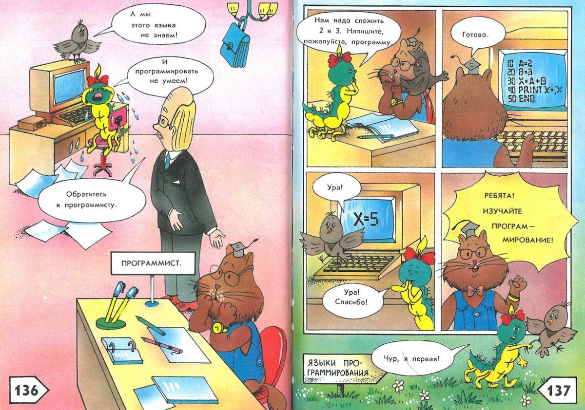 В 1991 году вышла детская книга о компьютере в виде комиксов. Я думаю, что часть работающих сегодня программистов начали вдохновляться интернетом и программированием именно с неё. У меня не было такой книги, но когда я узнала о ней во взрослом возрасте, захотела купить. И это несмотря на то, что её можно найти онлайн и полностью бесплатно. А всё потому, что я люблю интернет и те возможности, которые он мне даёт, а эта книга — символ свободного интернета 90-ых. Юмор, жизненные ситуации, яркие картинки и понятные объяснения делают её заманчивой для покупки и чтения 😊 Почитать чуть подробнее об этой книге можно здесь. Именно из этой статьи я узнала, что автор книги — физик, а не программист, как может показаться на первый взгляд. А вот купить, наверное, только на Авито. Средняя цена 2000 рублей. Всё потому, что раритет. Поддержать канал: лайком, комментарием, подпиской или донатом