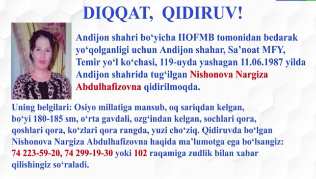 Сообщается, что жительница МСГ "Саноат" города Андижан Нишонова Наргиза Абдулхафизовна, 1987 года рождения, вышла из своего дома в неизвестном направлении и пропала без вести. Особые приметы гражданки: Рост 180-185см, волосы чёрные, глаза чёрные, лицо вытянутое.