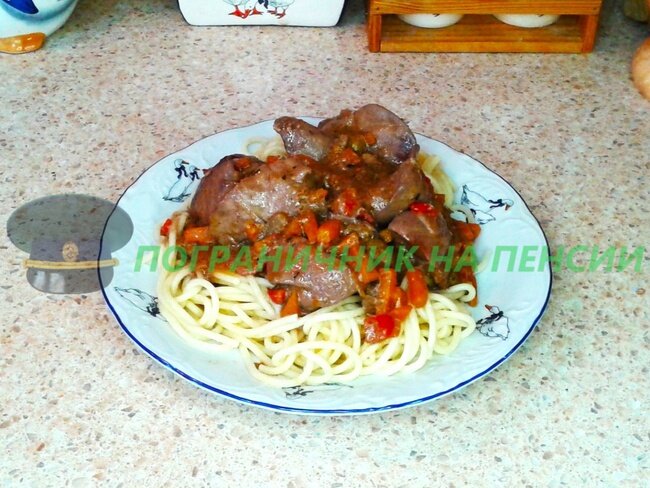 Сегодня шеф-повар Кузьма Васильевич проделал огромную работу. Во-первых провёл контроль качества печени. Во-вторых очень внимательно следил за соблюдением режимов приготовления. И всё оставшиеся время умудрялся оказываться на маршрутах моего передвижения, вынуждая обходить или переступать через него. Ингредиенты: 1. Куриная печень – 1 кг; 2. Перец болгарский (замороженный) – 3 шт.; 3. Лук репчатый – 2 шт.; 4. Морковь – 2 шт.; 5. Растительное масло – 100 гр.; 6. Сметана – 2 ст. ложки; 7. Мука – 1 ст. ложка; 8. Вода – 1 стакан; 9. Смесь перцев – по вкусу; 10. Смесь специй (кориандр, базилик, тмин) – 1 ст. ложка; 11. Соль поваренная – по вкусу. Печень вымываем, одну самую лучшую печёнку откладываем в разовую тарелку для предоставления шеф-повару на контроль. В казанок наливаем растительное масло, нагреваем его. В нагретое масло выкладываем лук нарезанный полукольцами. Лук обжариваем до слегка желтоватого цвета. Далее, в обжаренный лук выкладываем