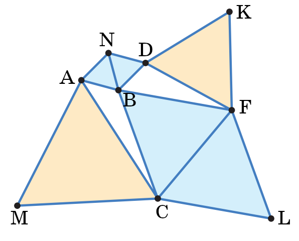 Задача: Шесть равносторонних треугольников расположены так, как показано на рисунке. Докажите, что сумма площадей четырёх голубых треугольников равна сумме площадей двух жёлтых. ©Математическая Вертикаль. Учебное пособие для общеобразовательных организаций. Автор: М.А.Волчкевич. Решение: S△ABN = S△BDN так как они правильные с общей стороной, по той же причине S△BCF = S△CFL. Пусть стороны мéньших голубых треугольников равны a, бо́льших голубых - b. Также пусть ∠ABC = α, тогда ∠DBF = 360° - 60° - 60° - 60° - α = 180° - α. Тогда сторона большего оранжевого треугольника по теореме косинусов равна: √(a^2 + b^2 - 2 * a * b * cos α); а мéньшего: √(a^2 + b^2 + 2 * a * b * cos α). Площадь правильных треугольников через сторону можно найти по формуле: a^2 * √3/4. Тогда сумма площадей голубых треугольников равна: a^2 * √3/4 + a^2 * √3/4 + b^2 * √3/4 + b^2 * √3/4 = a^2 * √3/2 + b^2 * √3/2 = √3(a^2 + b^2)/2. А сумма площадей оранжевых: √3(a^2 + b^2 - 2 * a * b * cos α)/4 + √3(a^2 + b^2 + 2 * a * b