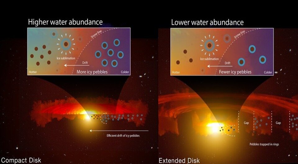 Исследователи выявили избыточное содержание водяного пара, с температурой 170–400 кельвинов и радиусом излучающей области 1–10 астрономических единиц, в компактных дисках, по сравнению с более крупными дисками. Это хорошо объясняется моделью дрейфа гальки, которая предсказывает, что компактные диски не препятствуют обогащению своей внутренней части водяным паром за счет транспорта ледяной гальки через снеговую линию. В крупных дисках с кольцевыми структурами такой транспорт будет нарушен и большая часть ледяной гальки останется во внешнем диске.