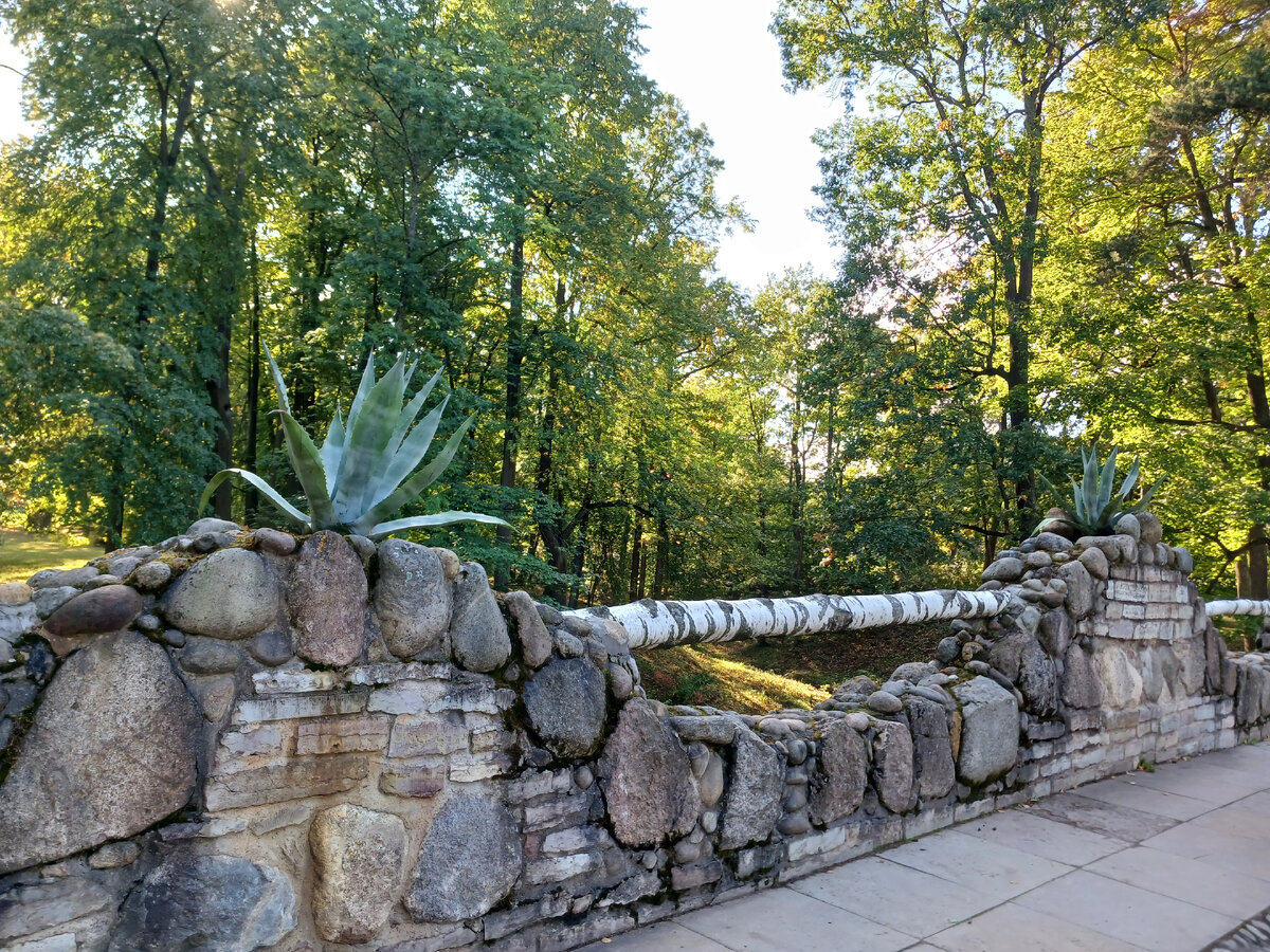 Из милого и спокойного дворца "Коттедж" пошли пешком в Фермерский дворец, прошли через своеобразный мостик с валунами, агавами и бревнами в качестве перил. Стоит стела "Работным людям - строителям Петергофа", по пути я видела голубой туристический паровозик, который отправляется от петергофского фонтана с шахматами и драконами, примерно полчаса ездит по территории парка Александрии. Паровозик не останавливается в Александрии и пассажиров не высаживает. По пути во дворец видела Готическую капеллу - очень необычный православный храм, ранее домовую церковь царской семьи. Фермерский дворец невысокий и светлый, обилие ярких цветов и южных растений навевает мысль, что этот дворец в Крыму, и за деревьями Чёрное море, а не Финский залив. Цесаревич Александр Николаевич получил этот дворец в качестве свадебного подарка от отца, затем семья императора Александра II использовала его в качестве летней резиденции. Этот дворец в большей степени посвящён Александру II, воссоздан его кабинет, другие ин
