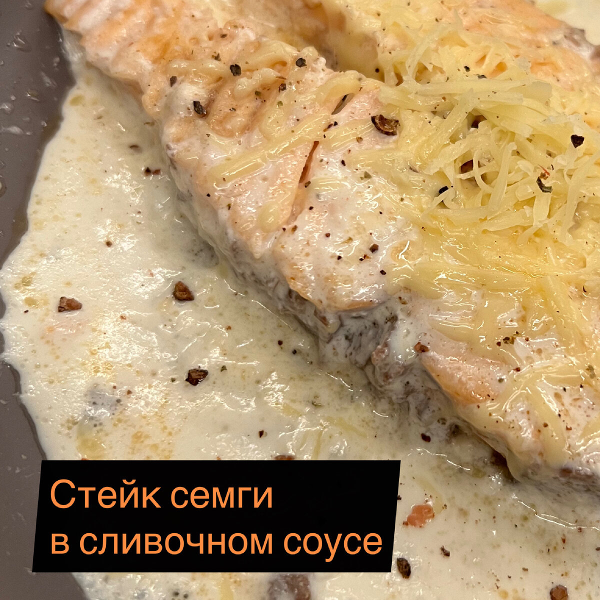 В этой статье готовим красную рыбу в сливочном соусе - в этом рецепте используется семга. Ингредиенты: (на одну порцию) Приготовление: 1) Берем размороженный стейк красной рыбы, моем, очищаем от кожуры и костей. 2) Ставим сковородку на плиту, наливаем масло для жарки и разогреваем сковородку. На хорошо разогретую сковородку выкладываем стейк рыбы. Обжариваем с двух сторон в течении 2-3 минут с каждой стороны до появления золотистого цвета на сильном огне. 3) Добавляем соль и перец на рыбу. 4) Добавляем 25-30 мл воды в сковородку, убавляем мощность плиты (нагрева), закрываем крышкой и тушим около 3 минут. 5) Выливаем сливки в сковородку и тушим ещё 3 минуты без крышки. Сливки должны загустеть. Их можно перемешать и налить сверху на рыбу с помощью ложки. 6) Выключаем плиту. Перекладываем рыбу на тарелку для подачи. Сверху выливаем оставшиеся в сковородке сливки, посыпаем тертым сыром. На этом можно закончить приготовление и получить такое вкусное и просто блюдо. Но также можно продолж