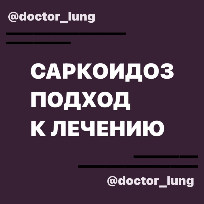 Напомню, что это СИСТЕМНОЕ ВОСПАЛИТЕЛЬНОЕ заболевание (могут поражаться многие системы организма), характеризующееся образованием в различных органах и тканях ГРАНУЛЁМ . Саркоидоз длительное время может быть бессимптомными и выявляться случайно (например, при рентгенографии легких или флюорографии во время диспансеризации). Для подтверждения максимально эффективна биопсия - именно микроскопическое выявление гранулем. Этиотропной терапии(действующей на причину) саркоидоза не существует. Причины до конца не установлены. Основной тактикой врача является сопоставление необходимости назначения лечения с тяжестью последствий от применения этого лечения. ⠀ ▪️Снижение ЖЕЛ, ОФВ1 на 10-15% по результатам спирометрии ▪️Снижение диффузионной способности лёгких (DLCO) на 20% ▪️Прогрессирование изменений на рентгене или КТ ОГК ЧЕМ ЛЕЧАТ ? Назначаются системные гормоны в дозе 20-30 мг в сутки с контролем через каждые 4-6 недель. При улучшении поддерживающая терапия: снижение дозы на 5 мг каждые