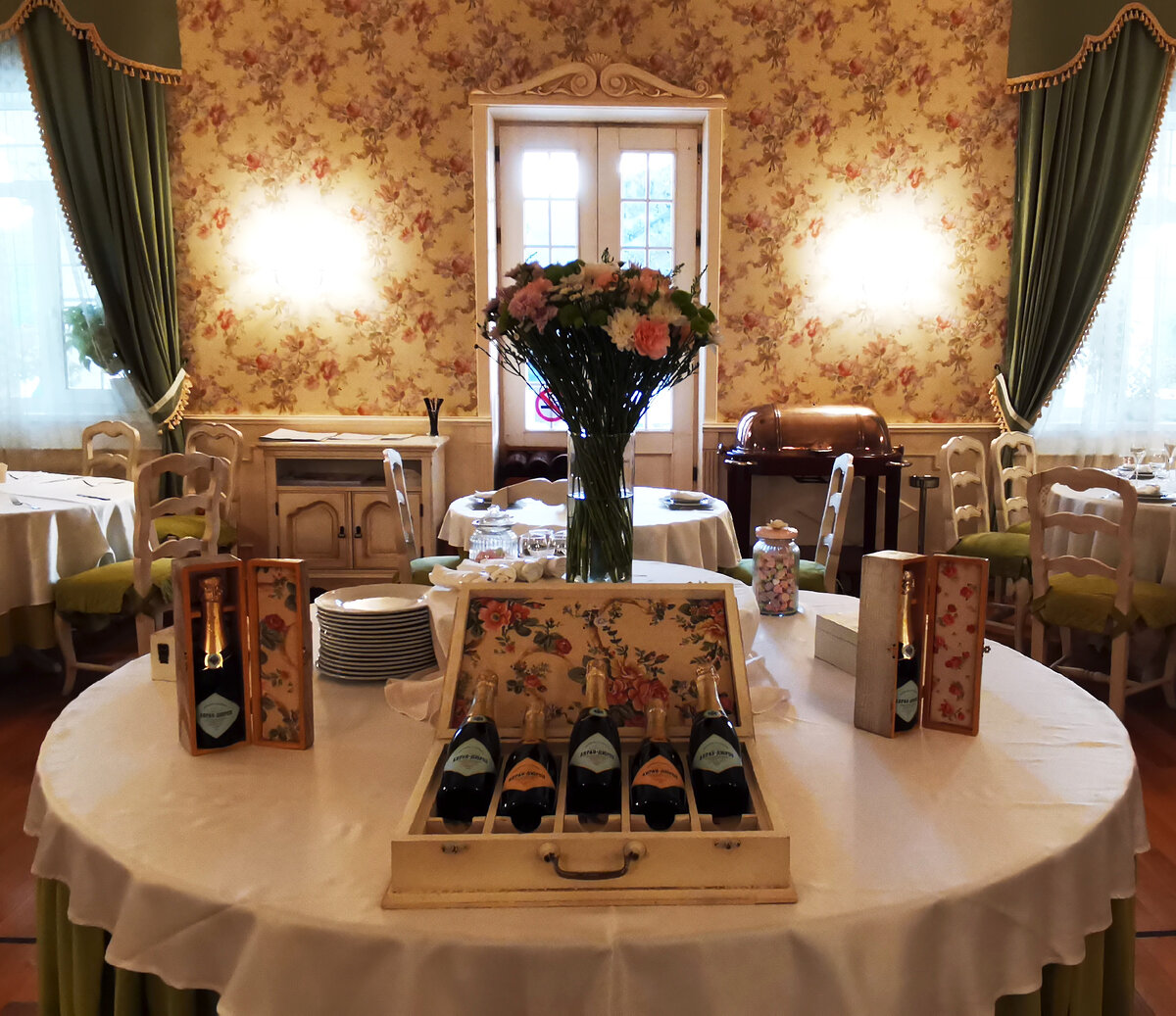 В зале в основном круглые столы с белыми скатертями и дорогой сервировкой, на окнах - тяжёлые зелёные шторы в тон мягкой мебельной обивки, множество небольших картинок и приятных глазу элементов декора на фоне витиеватых обоев с цветочным узором. Если честно, я не большой любитель подобного дизайна и стиля, но тут по этой части придраться абсолютно не к чему.