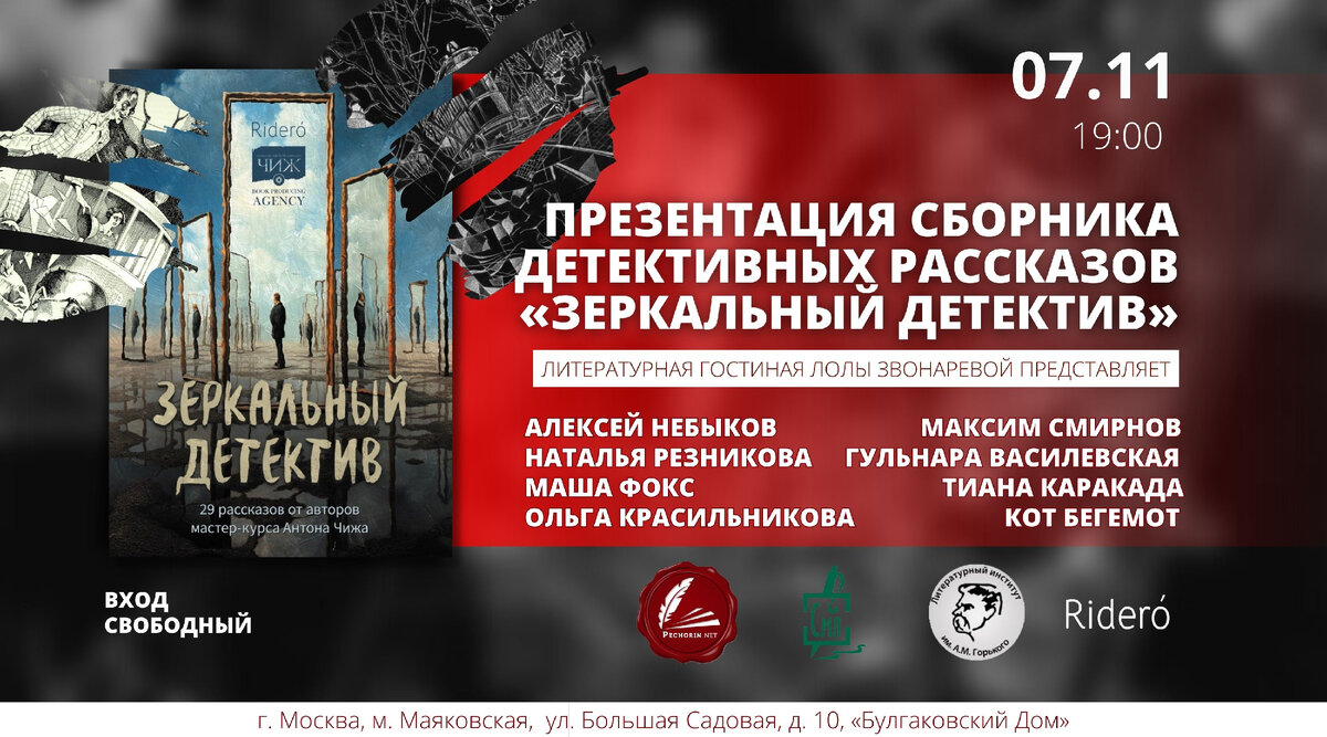 Друзья, 7 ноября в Булгаковском доме в Москве в Литературной гостиной Лолы Звонаревой состоится большой творческий вечер авторов «Зеркального детектива», сборника остросюжетных рассказов (импринт Антона Чижа «Новый русский детектив» в «Ридеро́»).