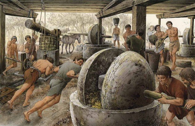 Оливки отжимали трижды, и каждый раз извлеченное масло собирали в разные емкости, поскольку качество также было разным: лучшее - при первом отжиме, а худшее - при последнем.