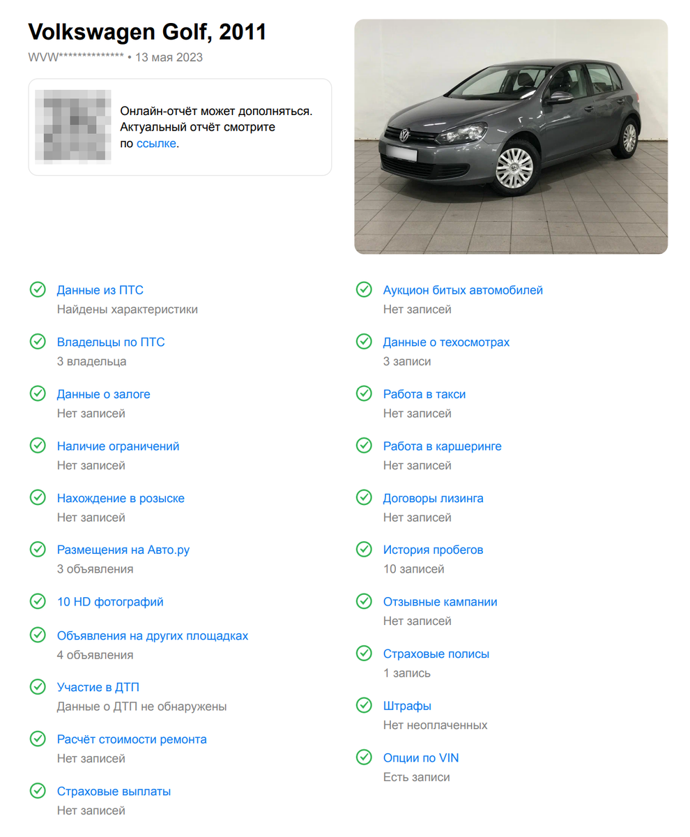 Итак, мы снова отправляемся на осмотр. На этот раз у нас достаточно популярный на вторичке автомобиль- Volkswagen Golf VI. Шестой гольф- это очень классный автомобиль, сочетающий в себе практичность семейного автомобиля, приятную управляемость и относительную экономичность. На гольфы с пробегом есть стабильный спрос и найти такой автомобиль в достойном состоянии с каждым годом все сложнее. И вот попался на глаза кристально зеленый отчет: Вся история автомобиля прослеживается. Первый собственник владел гольфом с момента покупки его у официального дилера в 2011, до середины 2019 года. Почти 8 лет. Потом еще 3 года машины была у второго владельца. И в начале января ее приобрел текущий собственник. Никаких зафиксированных аварий или страховых случаев, пробег прослеживается. Видно старые объявления о продаже. Мечта а не машина, едем смотреть! Встречает нас на осмотре чистый, блестящий автомобиль. С расстояния пары метров, он действительно выглядит очень достойно. А даже проверка кузова толщ