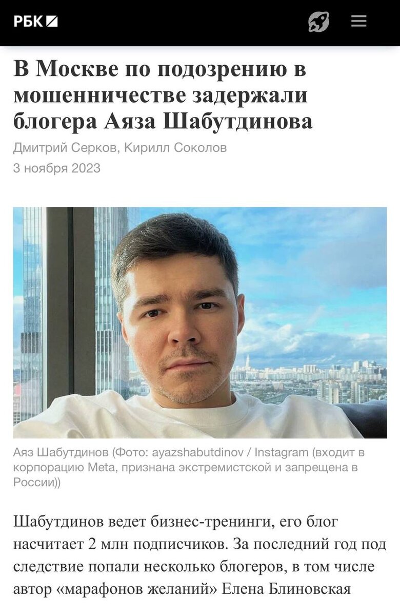 Блогер проведет в СИЗО месяц и 13 суток. Шабутдинов свою вину по делу о мошенничестве в особо крупном размере отрицает. Речь идет о восьми клиентах его компаний, которые заплатили от 100 тыс. руб. до 1,9 млн руб за образовательные курсы о том, как создать успешный бизнес и заработать на нем. Кроме того, СМИ сообщают, что директор компании, которая продавала обучение от Аяза, был объявлен в розыск, однако он успел выехать в ОАЭ. Московская прокуратура отмечает, что блогер вместе с соучастниками создавал ложное впечатление у клиентов якобы о том, что можно вести бизнес и получать много денег, если пройти его курсы.