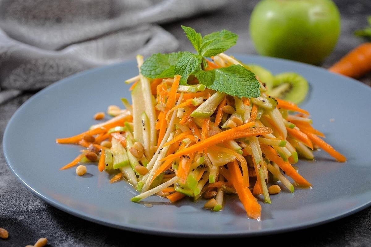 Салат с капустой, морковью и яблоками. Натрите капусту и морковь на терке, нарежьте яблоки на тонкие соломки. Смешайте все ингредиенты и добавьте немного майонеза и сока лимона. Посолите и поперчите по вкусу.