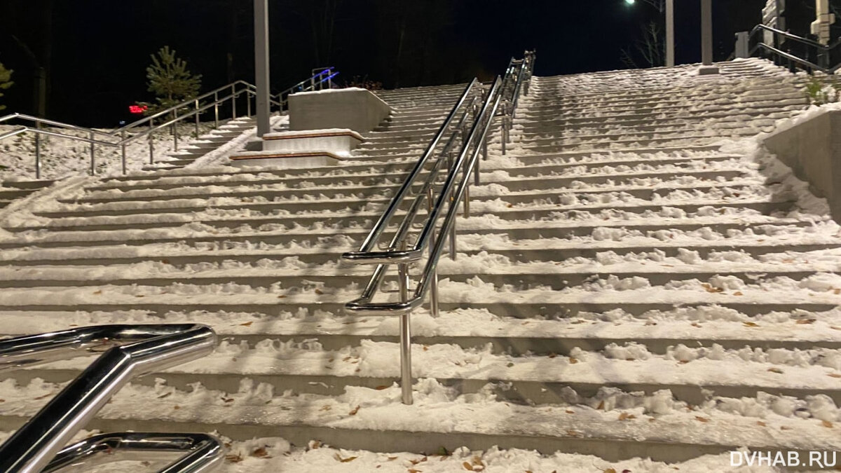 После выпавшего снега новая лестница, расположенная на стыке улицы Тургенева и Амурского бульвара, стала очень опасна для людей. Казалось бы, циклон прошел еще в ночь на пятницу и у коммунальщиков было время все убрать, но они этого не сделали. В итоге хабаровчане сами протоптали себе путь сквозь образовавшиеся сугробы. - Ни одна ступенька не почищена! Даже снег убирать не стали! А как ходить людям? Здесь постоянный поток, особенно стариков, которым небезопасно пользоваться такой лестницей, - возмутилась Надежда. Тот факт, что службы так и не приступили к расчистке объекта, привел к тому, что под снегом образовалась ледяная корка. Даже при наличии перил, которые, к слову, металлические и накаляются от холода, есть риск поскользнуться и скатиться вниз. - Для кого строили лестницу? Я сейчас спускался на бульвар и чуть вниз не улетел! Что это за безобразное отношение к жителям собственного города? - возмутился Леонид. Стоит отметить, что городские службы не удосужились хотя бы посыпать ст