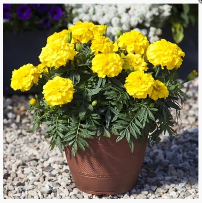 Делая заказ в одном из интернет-магазинов профессиональных семян, я обратила внимание на новую для меня серию триплоидных бархатцев Эндьюранс. Она представлена в трёх расцветках: - жёлтой; - оранжевой; и двуцветной золотистой (Sunset Gold). Триплоидные бархатцы славятся обильнейшим цветением. Семян не образуют, но стремятся выполнить эту заложенную природой программу и продуцируют огромное количество соцветий. Стерильный триплоидный гибрид получен скрещиванием бархатцев разных групп – отклоненных и прямостоячих. Хорошо облиственные кусты высотой 30 см усыпаны махровыми соцветиями Ø 7-8 см, гвоздиковидной и скабиозовидной формы, различной окраски, в т. ч. двухцветной. Гибрид хорошо переносит дождливую погоду. Назначение универсальное – для оформления цветников и на срезку. Производитель семян английская компания Floranova, которая специализируется на селекции декоративных цветочных культур для профессиональных производителей рассады и горшечных растений. Серия Эндьюранс является но