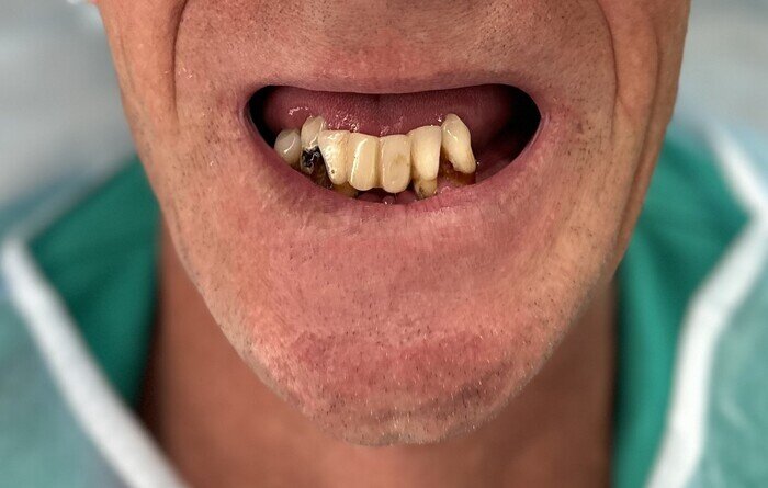 Как пациент дошёл до такой жизни? Да так же, как и многие. Ничего зазорного не вижу. Ситуации разные, приоритеты в жизни разные. Может, было не до зубов - были дела и заботы поважнее. Сейчас, осознав и прочувствовав "прелесть" жизни беззубой, было принято волевое решение этот недочёт исправить. В данном случае все показания к методике тотальной имплантации и протезирования по методике "всё на 4-х" имеются, берёмся за работу. Посмотреть предысторию и развитие событий можно тут. Приличный человек, не бомж (да вы и сами скажете, что операция дорогая и "потянет" её не каждый - справедливо), не алкаш. Да, такие зубы и проблемы бывают у самых обычных людей, к которым никак нельзя "приклеить" ярлык "маргинальная личность". Никакого клейма порока на них нет в 90% случаев. Когда-то, в далёкие былые времена допотопные, такие люди теряли зубы, обзаводились съёмными протезами и хорошо, если не сильно теряли в качестве жизни - протезы "садились" удобно. Если же "любви" не случалось, то жизнь мрачне