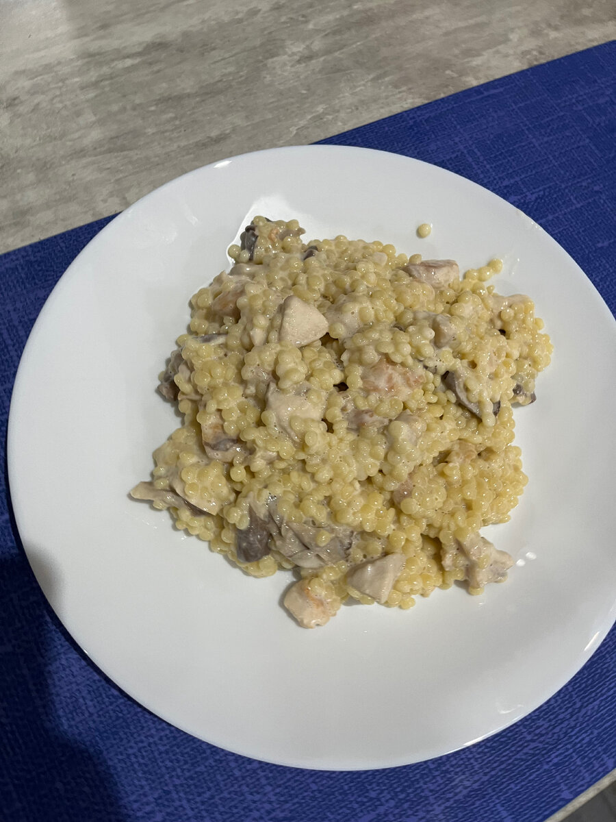 Сегодня мы с вами приготовим очень вкусную пасту птитим! 🍝Нам понадобится:🍝 Вешенки 400 грамм Сливочный сыр 100 грамм Сливки 100 мл Птитим 400 грамм Куринное филе 2 шт Специи по-вкусу Первым делом мы нарезаем куриное филе кубиками и начинаем обжаривать на сковороде с подсолнечным маслом. Пока курица обжаривается, мы моем и нарезаем грибы вешенки. После этого добавляем их к курице. На сковородку добавляем пару ложек сливочного сыра и небольшое количество сливок. По консистенции можно сделать более густой, добавив сыра или более жидкой, добавив сливок. Начинаем варить птитим. Птитим- это макароны, поэтому их приготовление не составит труда. Кладем макароны в кипящую воду примерно 1:5. Можно посолить по вкусу. И варим примерно 10-13 минут. После чего сливаем воду. Добавляем птитим на сковородку. И всё вместе перемешиваем. Вот и всё! Получилась очень вкусная сливочно-сырная паста! 🍝 🍝Желаем удачи в готовке!🍝