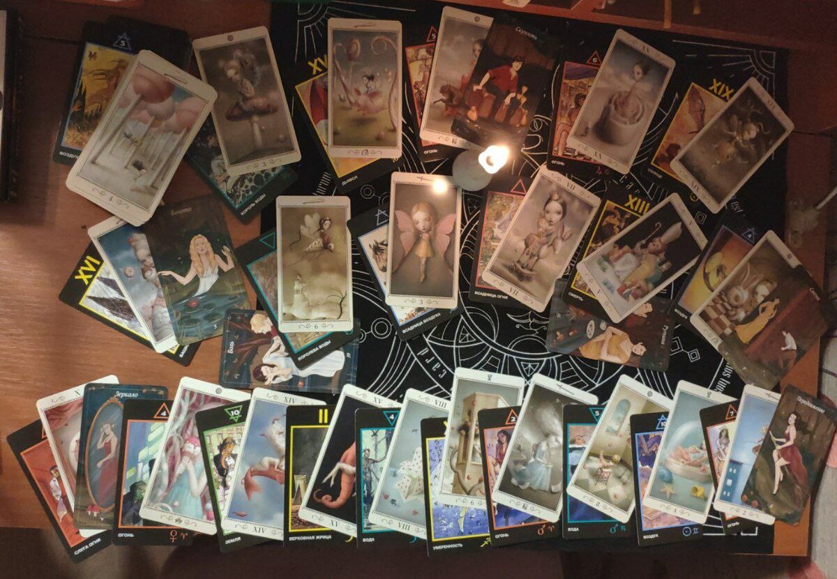 Дно колоды – 5 воздуха + 4 жезлов + Забота. Фоном данного расклада выходят карты, которые показывают, что сейчас у участников этого любовного треугольника присутствуют разбитые мечты, после которых есть желание восстановление эмоциональной стабильности, а также желание двигаться дальше и не останавливаться на достигнутом. Ведь всем здесь хочется достичь для себя благополучных, счастливых, теплых и стабильных отношений, где есть глубокая симпатия, крепкая привязанность, забота, нежность, уважение, откровенность и искренность.