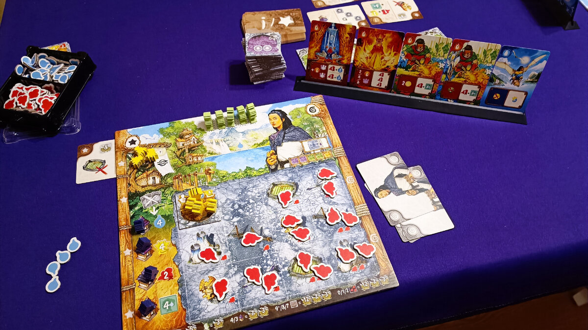 В игре Племена ветра мы боремся с последствиями многовековой эксплуатации планеты, в результате чего появился новый вид загрязнения, уничтожающий всё живое. Игроки возглавляют племена ветра (так как они перемещаются по воздуху, не касаясь земли), которые строят новые поселения, возрождают леса и борются с загрязнениями с помощью магии стихий. У всех игроков есть 5 карт, которые устанавливаются на стойки, чтобы их рубашку было всем соседним играм. В свой ход игрок может сделать три возможных хода: Разыграть карту стихий - самое частое действие в игре, и в этом действии заключается вся суть игры и основная механика. Потому что для розыгрыша карты часто требуется учитывать не только свои карты, а карты соседей справа и слева. Например при розыгрыше левой карты воды на предыдущей фотографии, если у меня карт земли (зеленых) меньше чем у одного из соседних игроков, я получаю 4 воды, если меньше чем у обоих, то получаю 6 воды, или размещаю жетон леса на своем планшете. Есть эффекты, котор