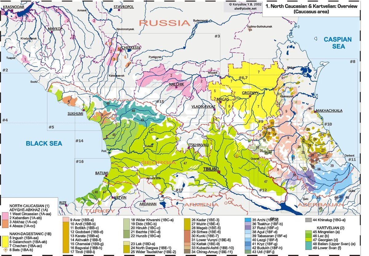 Начну серию постов о языках Кавказа с этой карты замечательного лингвиста и картографа Юрия Корякова*.