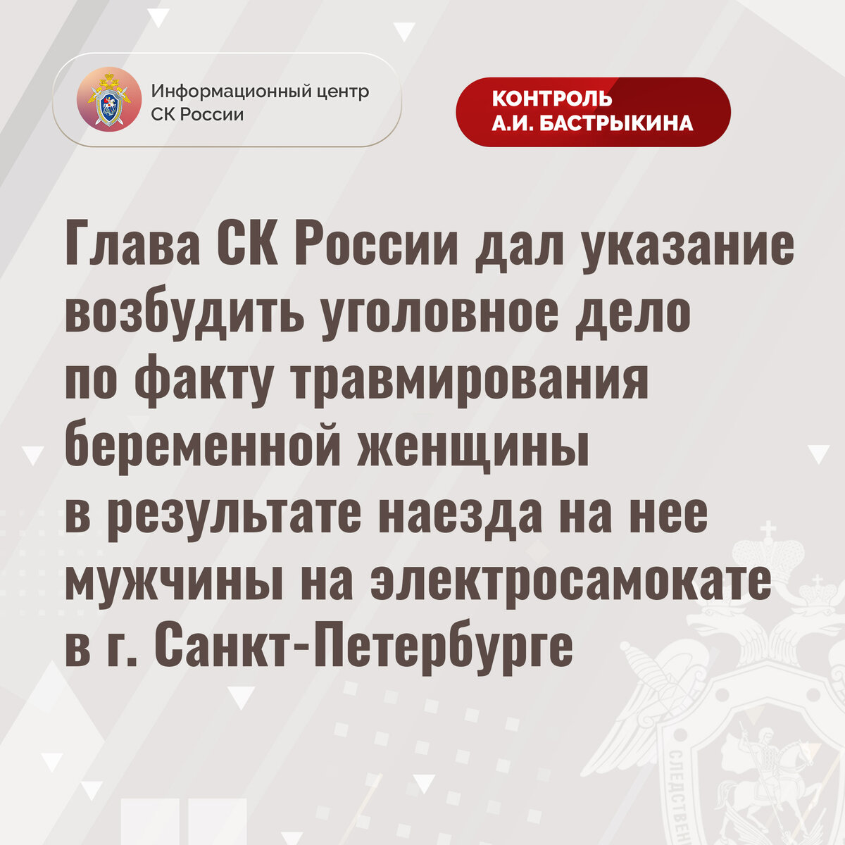 Глава СК России дал указание возбудить уголовное дело по факту травмирования беременной женщины в результате наезда на нее мужчины на электросамокате в г. Санкт-Петербурге