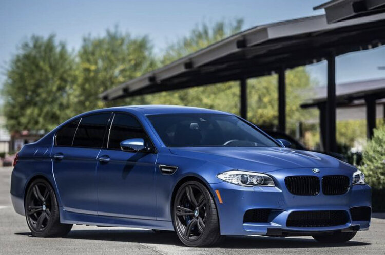 Экстерьер спорткара BMW M5 F10 2012 года фирменный. Его внешность от стандартных моделей почти не отличается. Основная фишка – М-пакет. Спортивного обвеса у обычных моделей нет. У седана оригинальные диски R20. Фронтальный бампер лишился «противотуманок». На их места встали дополнительные воздуховоды. Их функция – направление воздушного потока к тормозным дискам. Это нужно для эффективного охлаждения. На фронтальных крыльях имеются «жабры». Их предназначение – отвод из-под капота горячего воздуха. Немцы придали внешним зеркалам аэродинамическую форму. Немецкие инженера объяснили, что если интенсивно ездить 20 часов, зеркала просто вырываются из креплений. При предельных скоростях воздушный поток, идущий навстречу, оказывает на них запредельное давление. На корме можно заметить четыре выхлопные трубы, расположенные попарно. У бампера имеется маленький диффузор. Все прочее аналогично стандартной версии. По габаритам BMW является среднеразмерным автомобилем. В длину спортивный седан вытя