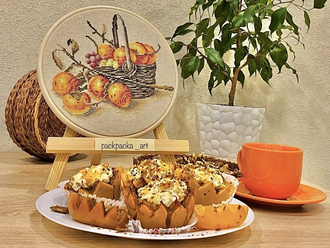 Когда вышились все полюбившиеся корзинки от Риолис, мне случайно на глаза попалась разработка от «Золотое руно». Причем похож был не только сюжет и основа (Aida 14 под лен), но и стилистика. Главное отличие от разработок "Риолис" было в размере и технике вышивания. Далее расскажу поподробнее о внесенных мною изменениях в вышитый сюжет. Размер «Хурма» от «Золотое руно» занимала 21х27 см, в то время как схожие сюжеты «Риолиса» были или 25х25 (цветочные корзинки), или 20х20 (фруктово-ягодные корзинки производителем предлагались на более крупной канве, но я заменила все на 14 каунт). Сначала я хотела вышить все по набору, и просто вставить готовую вышивку не в прямоугольную, а в квадратную раму. Мол, пусть будет больше воздуха сверху. Когда я еще раздумывала над покупкой этого набора, то предварительно посчитала, что сюжет от "Золотого руна" примерно впишется в размеры подобных от "Риолис". Но почему -то мне и голову не пришло заранее померить кусок канвы в наборе "Золотого руна", чтобы