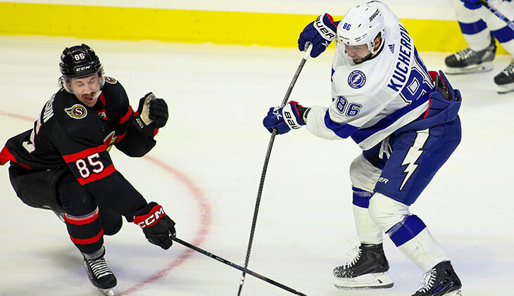 В одном из самых результативных матчей дня «Тампа» переиграла «Оттаву» (6:4). Главный герой встречи – Никита Кучеров, у него 5 (1+4) очков. На утренней тренировке Кучерова поставили к Алексу Барре-Буле и Энтони Сирелли, и можно было подумать, что Никиту перевели в третье звено. Основания для экспериментов были: в двух последних матчах «Тампа» проиграла, а Кучеров не набрал ни одного очка. Но звено Кучерова у «Лайтнинг» по умолчанию ударное, и скорее новых партнеров пробовали с Кучеровым, а не его с ними. Это иллюстрирует время на льду: у Никиты с отрывом в 2,5 минуты самый высокий айстайм среди всех нападающих (21:00). Никита начал матч с Барре-Буле и Сирелли, на третьей минуте у «Тампы» выпал нападающий Остин Уотсон (из-за драки), и на одну смену Кучерова вернули к Брэйдену Пойнту. Второй раз их соединили в конце первого периода, и форварды сразу ассистировали Виктору Хедману. Этот гол стал 145-м в карьере шведского защитника и вывел его на девятое место в списке лучших снайперов «Там