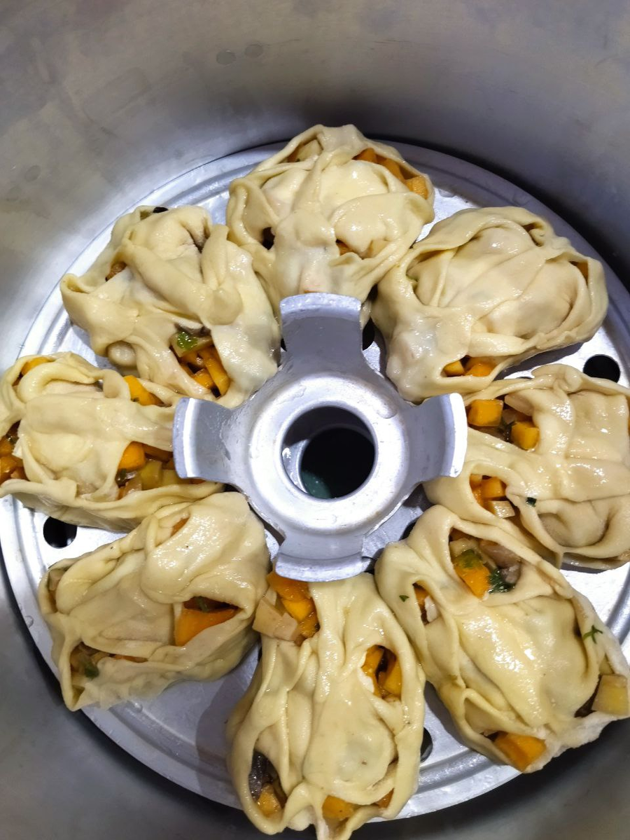 Тыкву, картофель хорошо вымыть, обсушить, нарезать мелкими кубиками. Очистить лук и нарезать мелкими кубиками. Грибы помыть и нарезать мелко. На сковороду добавить немного масла, специи и половину нарезанного лука. Обжарить лук, добавить нарезанные грибы и обжарить с луком 10-12 минут. Вторую половину лука и обжаренные грибы, нарезанную зелень, соль специи добавить в начинку. На тонко раскатанные кружки (около 10 см в диаметре) выкладываем столовую ложку начинки с горкой, сверху кладем небольшой кусочек сливочного масла. Слепить мант, оставляя отверстия для пара. Решетки от пароварки смазать растительным маслом, каждый мант обмакиваем в растительное масло и обмазываем верх и бока маслом (что бы не слиплись). Ставим в пароварку на закипевшую воду, время приготовления 30-40 минут. Снять пароварку с огня и дать постоять 10-15 минут. Выкладываем манты на блюдо и смазываем сливочным маслом или жирной сметаной.
