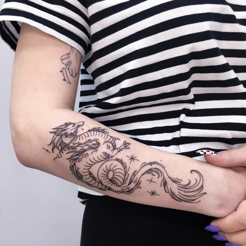 ⠀ Хозяйка данного дракона раньше делала лишь миниатюрки до ~8см И когда решилась на эту татуировку, почувствовала некоторый дискомфорт, ведь она такая БОЛЬШАЯ ⠀ На деле, это лишь дело привычки - она привыкла к маленьким обновочкам на своем теле, и выход за эти рамки может немного смутить, ведь это абсолютно новые ощущения ⠀ Другому же человеку, который мыслит в масштабах рукавов и забитых спин этот дракончик покажется истинной миниатюркой)) ⠀ Правда в том, что каждый сам определяет рамки своего комфорта, и это нормально ⠀ Главное, чтобы татуировка нравилась именно вам - вы вдохновлены ее идеей, вам нравится ее вид, смысл и она находится "на своем месте" Когда вы уверены в своем выборе, вы будете искренне радоваться каждой своей обновочке, даже если это непривычный для вас формат