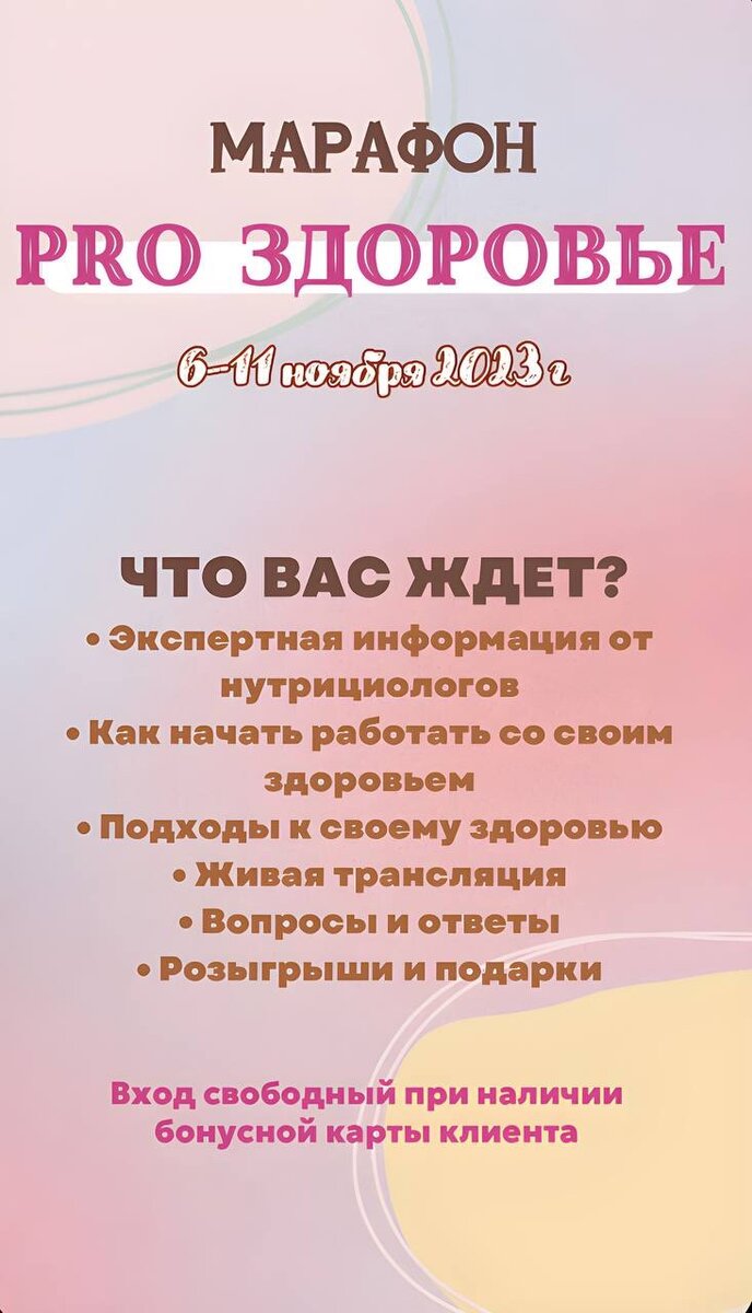 Что вы узнаете ? Какие опасности по здоровью подстерегают вашу семью в осенний период и как им противостоять !! Где живет иммунитет и как его укрепить ! Когда БАДы не работают Что делать с детьми - малоежками, сладкоежками, как наладить правильный режим питания для всех членов семьи ! !Как правильно худеть без вреда организму, изнурительных диет и тренировок Как вернуть себе ресурсное состояние, энергию и работоспособность И МНОГОЕ ДРУГОЕ!! Где будет проходить марафон? Марафон будет проходить в закрытом телеграмм канале. Как попасть на марафон? Написать в комментариях "Иду на марафон" и я добавляю всех желающих в чат марафона. ВХОД на марафон БЕСПЛАТНЫЙ для ВСЕХ у кого ЕСТЬ бонусная карта Siberian wellness У кого еще нет своей бонусной карты, я вам ее просто ПОДАРЮ #марафонздоровья