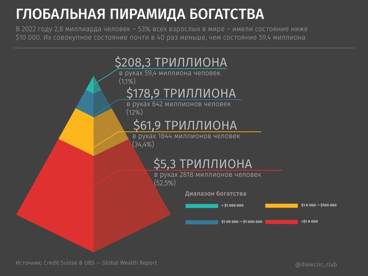 Отчёт о глобальном благосостоянии, подготовленный двумя крупнейшими финансовыми конгломератами Швейцарии: Совокупное благосостояние 2,8 миллиарда взрослых людей, составляющих основание пирамиды богатства, почти в 40 раз меньше состояния 1,1% самых богатых людей на планете. Разница между теми, кто находится на вершине, и теми, на чьих плечах это всё держится, заключается в том, что, основание пирамиды характеризуется широким разнообразием людей из всех стран и на всех этапах жизненного цикла. В отличие от них, люди с высоким доходом в значительной степени сосредоточены в Северной Америке (42%), Европе (27%) и в Азиатско-тихоокеанском регионе (17%). Как правило, они ведут схожий образ жизни: участвуют в одних и тех же глобальных рынках товаров роскоши, имеют одинаковые возможности для отдыха и получения образования для своих детей, даже если они проживают на разных континентах. «Имущественные портфели» богачей более похожи друг на друга, они уделяют особое внимание финансовым актив