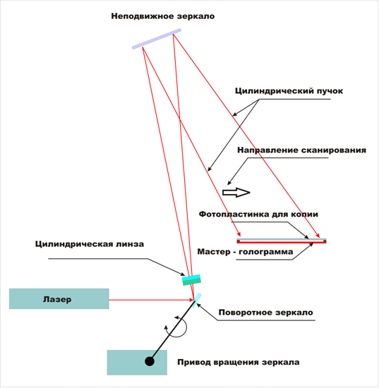 1. Копирование отражательных голограмм. Можно создать не хитрое устройство копирования, схематически изображенное на рисунке. С помощью неподвижной цилиндрической линзы отраженный от поворотного зеркала луч образует на мастер-голограмме полоску света, которая медленно (в соответствии с чувствительностью фотоматериала) перемещается по голограмме перпендикулярно плоскости падения восстанавливающего изображение пучка. Зазор между мастером и фотопластинкой 1 – 2 мм. Сканирующий луч падает на сэндвич из мастера и фотопластинки копии под углом восстановления изображения. Неподвижное зеркало можно закрепить на балке под потолком, а сэндвич –