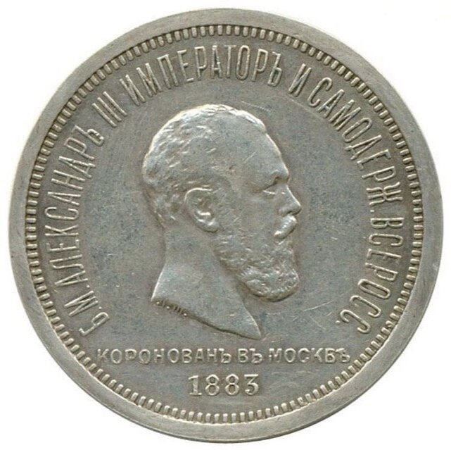 1 рубль «Коронация Александра III». 1883 год. Торжественное событие, посвящённое коронации нового императора, проходило значительно позже после вступления на престол монарха. Коронация Александра III прошла только через 2 года. Для солдат, участвовавших в параде, выпустили 60 тысяч памятных рублей с портретом императора на лицевой стороне и царскими регалиями на другой, штемпели изготовил Леопольд Штейман. Часть монет выпустили в исполнении пруф. Позже был произведён повторный чекан ещё около 220 тысяч штук. Это один из самых массовых памятных рублей императорской России.