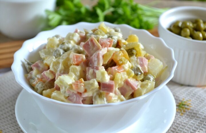 Салат Оливье занимает первое место практически у каждой хозяйки на праздничном столе. Во-первых, рецепт салата Оливье очень прост, его не забудешь, во-вторых, готовится салат легко и просто. Лично у меня не обходится ни один праздник без этого блюда. Продукты Картофель отварной (в мундире) - 400 г Морковь отварная (в мундире) - 150 г Яйца вареные - 6 шт. Огурцы соленые - 300 г Колбаса вареная - 300 г Майонез - 300 мл Горошек зеленый консервированный - 1 банка Лук зеленый - 1 пучок (36 г) Соль (по желанию) - по вкусу Перец молотый (по желанию) - по вкусу Какой салат вкуснее Оливье или Цезарь?