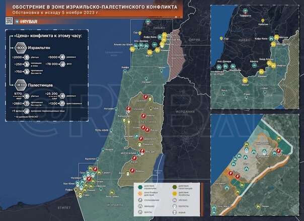 Армия обороны Израиля (ЦАХАЛ) сообщает, что окружила город Газа, и, выйдя к морю, разделила сектор Газа на две части — северный и южный. Правда, независимого подтверждения этому нет. Нам приходится верить на слово. В любом случае, удалось ли это израильтянам, или не удалось — им придется штурмовать город Газа. А там плотная городская застройка и подземные тоннели. И то, и другое придется штурмовать. Так что бои в секторе Газа еще очень далеки от завершения. И варварские бомбардировки мирного населения израильтянам тут мало помогут. Если помогут вообще. Продолжаются обстрелы на ливано-израильской границе. Движение «Хезболла» обстреливает ракетами из Ливана территорию Израиля, израильтяне отвечают. Ну вот в принципе и всего. Можно, конечно, добавить в текст названия палестинских деревень, которые ничего не говорят ни мне, ни вам — но не считаю это нужным. Желающие могут сами посмотреть по карте. Карта взята отсюда https://t.me/rybar/53954 На этом все. Следим за новостями!