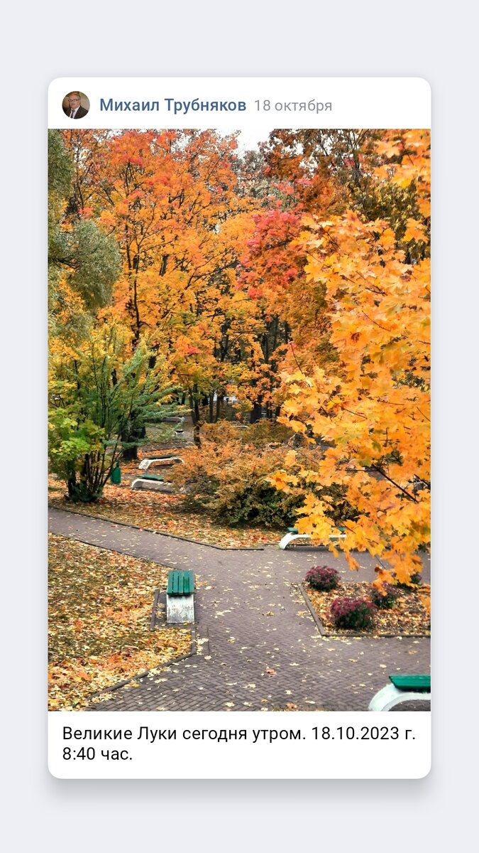 Дорогие друзья! В этом году осень подарила много прекрасных моментов, которые ни кого не могут оставить равнодушними. Я очень хочу поделиться с вами красотами любимого города Великие Луки и представить несколько осенних зарисовок. ДА! ОСЕНЬ НАС СПОСОБНА УДИВЛЯТЬ… Михаил Трубняков Осенняя пора для каждого своя. Для всех людей, с момента мирозданья, Кому-то дарит первый поцелуй, Другим приносит горечь расставанья. Приходят осенью и свадьбы, и веселье И наполняют праздником ваш дом. Детишкам осенью особые волненья, Что связаны, конечно, с сентябрём. Да! Осень нас способна удивлять И в хмурый день, и в ясную погоду, Ловушки взглядам ловко расставлять, Раскрашивая в золото природу! Она пропитана дыханием полей Со вкусом ароматных спелых зёрен, С прощальным клином серых журавлей, Что покидают севера до тёплых вёсен. Дождями осень наполняет русла рек. Пока зима в пути и белые метели, Нам осень дарит первый рыхлый снег И из следов сплетает канители. Не зря, наверно, осень