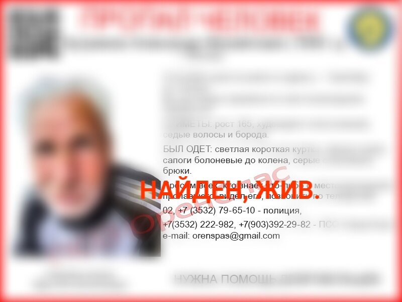 В Оренбургской области сотрудники полиции и волонтёры ПСО «ОренСпас» устанавливают местонахождение Александра Бугримова. Мужчина 1958 года рождения страдает деменцией. 31 октября 2023 года он ушёл из дома по улице Ногина Оренбурга и пропал. До настоящего времени местонахождение пенсионера неизвестно. Как отметили волонтёры, Александр Бугримов уже пропадал. Его нашли в районе станции Сырт под Оренбургом. Приметы: рост 165, худощавое телосложение, седые волосы и борода. Был одет: светлая короткая куртка, чёрная шапка, сапоги болоньевые до колена, серые спортивные брюки. Всех, кто что-либо знает о местонахождении пропавшего или видел его, просят позвонить по телефонам: 02, +7 (3532) 79-65-10 — полиция, +7(3532) 222-982, +7(903)392-29-82 — ПСО «ОренСпас». По информации на 6 ноября, мужчина найден живым.