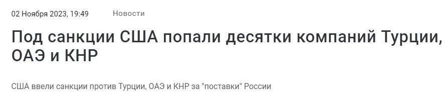 Последний санкционный пакет США, что был обнародован в самом начале ноября, помимо российских компаний, определил в SDN-list довольно большое количество компаний из других стран, которые помогали России обходить действующие ограничения. Ранее такие случаи были единичными, сейчас это уже стало более масштабным явлением. И причем это не т.н. "фирмы-прокладки", созданные самой Россией, которые уже блокировались ранее, а именно крупные, известные и давно действующие компании других стран. Из всего этого можно сделать вывод, что разработчики санкций теперь уже стали расширять свои ограничения за пределы России на компании, которые с ней тесно сотрудничают в "нежелательных" сферах. Теперь чуть подробнее. Вот что сказано в пресс-релизе Минфина США о введении нового пакета санкций: Компании, базирующиеся в КНР, Турции и ОАЭ продолжают отправлять в Россию высокоприоритетные товары двойного назначения, включая важнейшие компоненты, на которые Россия опирается при создании своих систем вооружения