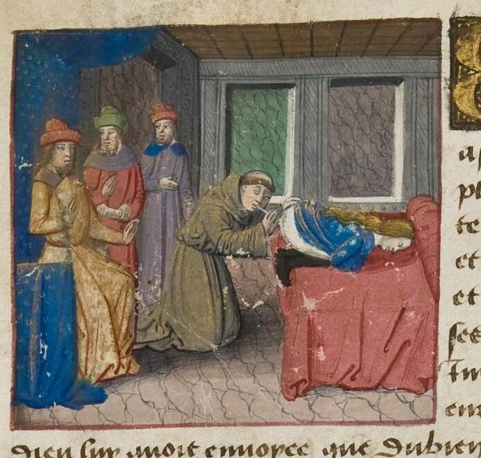 Деву положили на кушетку, прикрыли ей седалище белой тканью, чтобы не смущать уже монаха, проделали в ткани дырочку в нужном месте и позвали монаха лечить.