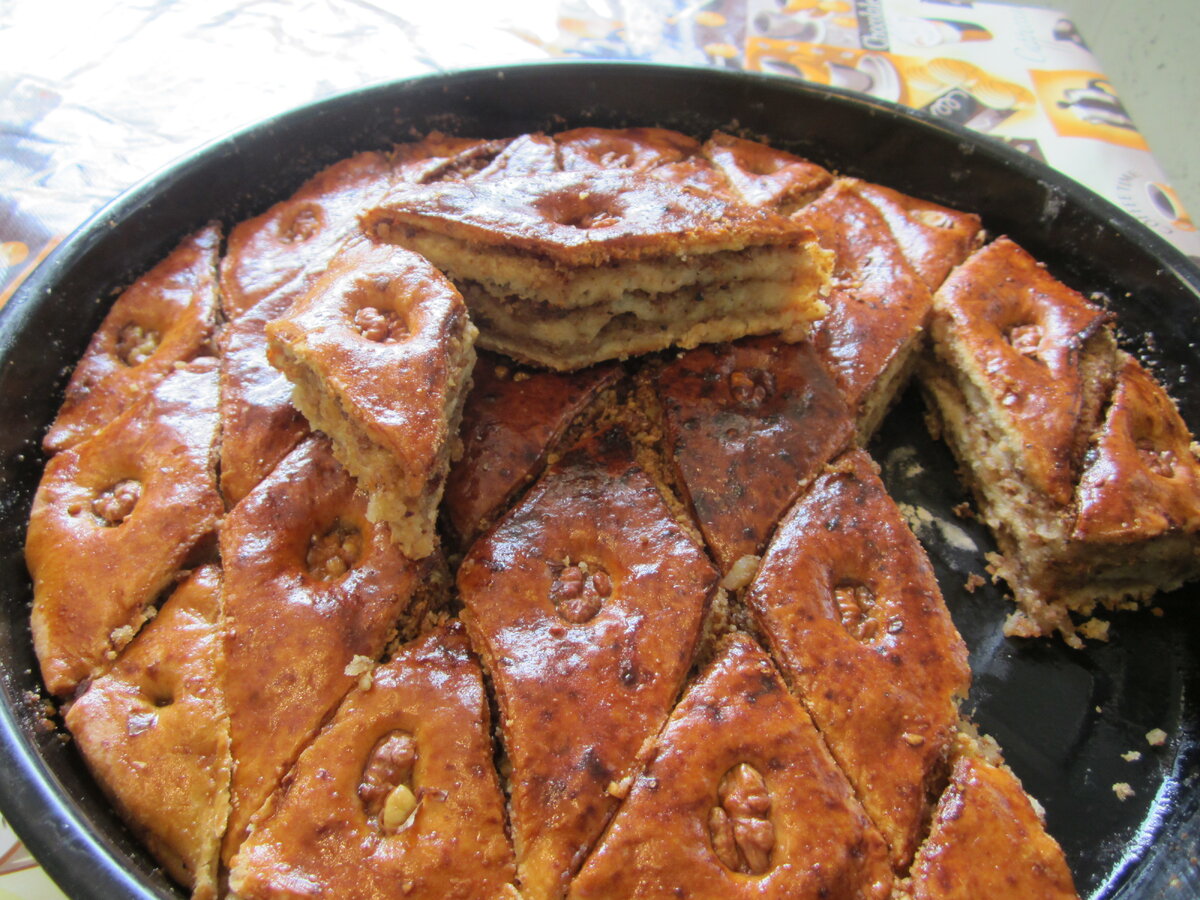 Остались прошлогодние запасы орехов, что-то надо делать с ними. Решила остановиться на пахлаве, никогда ее не делала. Делюсь ее рецептом! Ингредиенты Приготовление В 150 мл теплого молока растворить половину маленькой упаковки сухих дрожжей и 1 ч. ложку сахара, смешать 2 яйца, 150 г сметаны, соль, выложить к дрожжам и замесить тесто с 500 г муки. Оставить подниматься, а тем временем заняться начинкой.