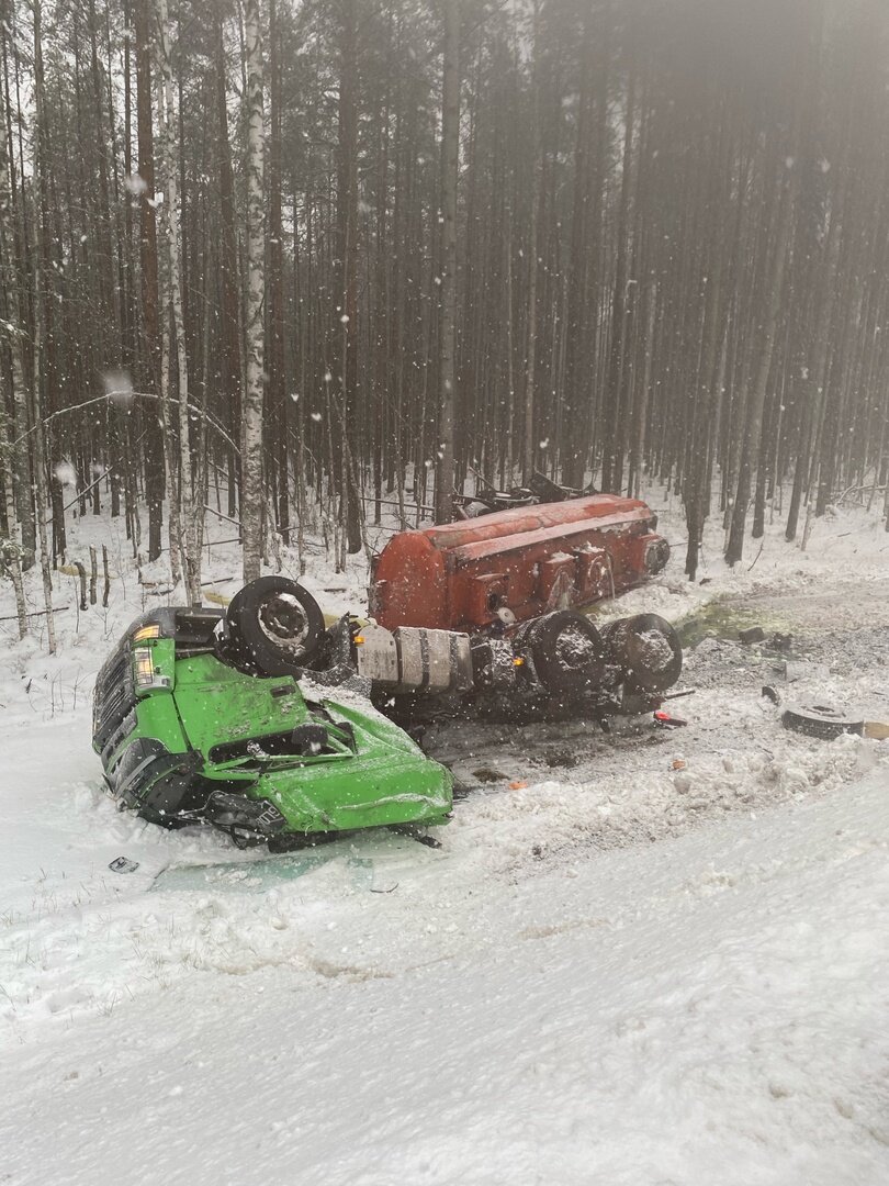 Напомним, инцидент произошел накануне в районе съезда с трассы «Кола» на дорогу в направлении Костомукши. Тягач опрокинулся. Водитель погиб. фото: © Павел Сийконен / паблик ВК «ДТП Петрозаводска и Карелии»