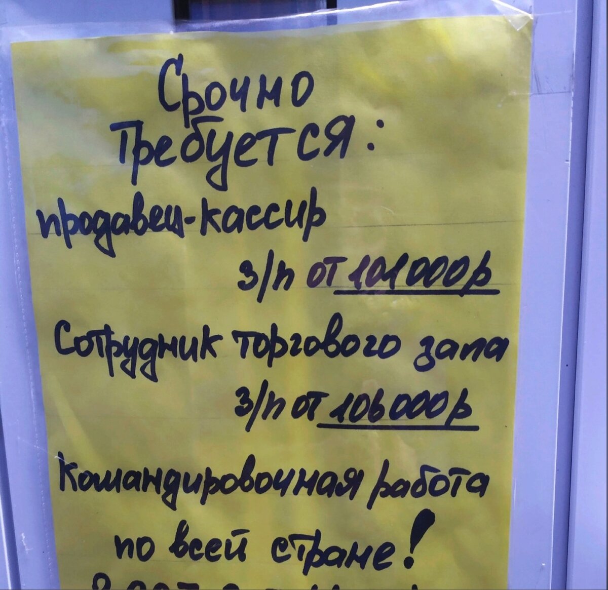 Это объявление висит на двери "Красное&Белое" два месяца точно, а может и больше, только раньше другие телефоны для связи были указаны. 106000! Огромнейшая зарплата для нашего города! Правда надо в командировки ездить, ну и что? Хочешь заработать - съездишь! Но, раз объявление до сих пор висит, значит желающих не нашлось? А почему? Мне кажется, не всё так просто, как и во многих объявлениях о работе вахтой. 100 тысяч - хорошая зарплата, но только если соблюдается трудовой кодекс. А он не соблюдается. Если человек будет работать месяц без выходных, 100 000 - это мало. Тем более жить ему придётся не в комфортабельном гостиничном номере. В "Красное&Белое" и без командировок хорошую зарплату предлагают, в два раза больше, чем в других магазинах, но в итоге она получается намного меньше обещанной из-за штрафов. Но, даже если ты будешь идеально работать, за обычную смену, 2/2, зарплата не будет как в объявлении, обязательно надо выходить на подработку. В нашем городе в "Красное&Белое" работа